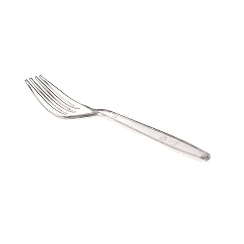 מזלג חד פעמי עשוי מפלסטיק בצבע שקוף איכותי וקשיח.